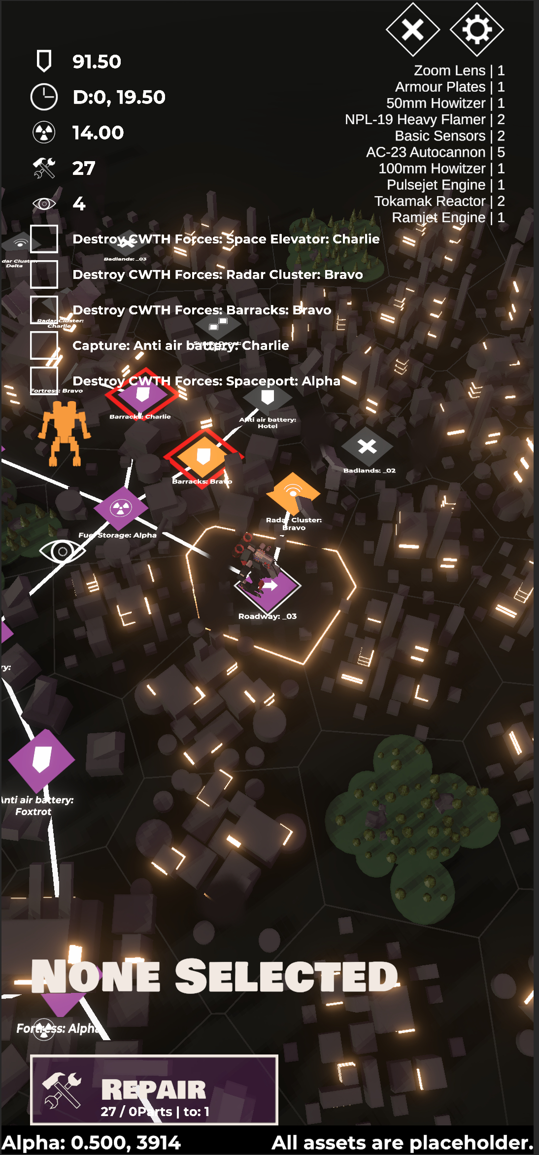 And voila, I now had a plan for the things that needed to be changed. So now, when you start a campaign, a mechanic not unlike Darkest Dungeon’s recon system reveals the contents of nodes that are close to you at semi random intervals, a new rare and limited resource (UAV’s) has been added to allow you to fire this recon at will, paths between nodes are hidden (though not inaccessible!) and decision nodes have been hidden entirely. Now it really feels as though you’re traversing unknown territory and finding your way through a dense colonial cityscape, and you’re always at risk of spending too many resources on going the wrong way, or running blind towards your goals. The one concession to all of this extra difficulty is that at any point you can choose to leave via a spaceport/space-elevator, and that you always start at one.