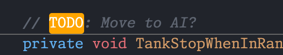 One of the odd function calls inside the update loop. I’m in the process of deciding if this should be inside the AI code for tank enemies or not so it’s flagged as such. I like using TODO’s particularly with a highlighter extension in vscode that also indexes the locations and count of TODO’s, so that I can come back to them later.
