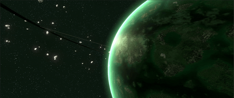 In the skybox art in Interloper Rayleigh Prime has a Commonwealth constructed orbital ring, and attached space elevators. These play a function in the game, but I wanted to represent them here in the menu too as these structures are both colossal and also very sci-fi.