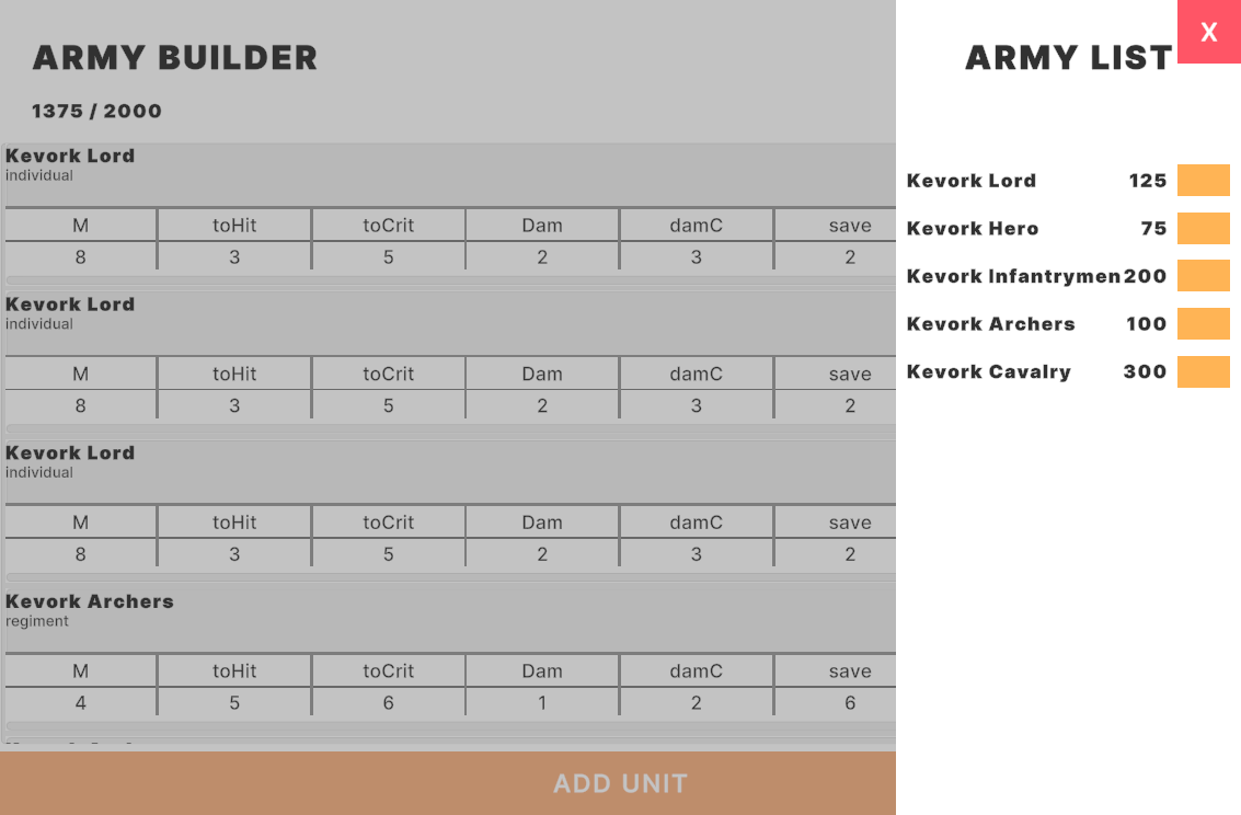 - Setup debug roster to be competetive and interesting ~2000pts